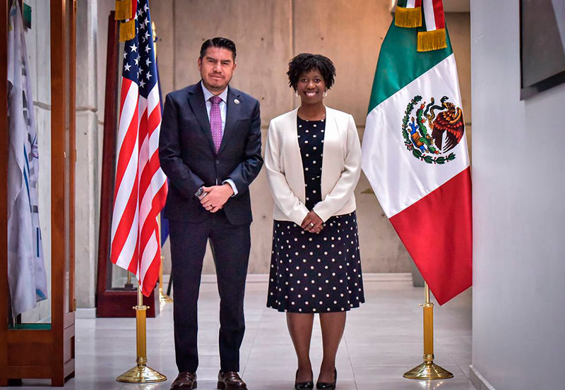 En la reunión estuvieron presentes Brittany Thompson, cónsul de Prensa y Cultura; María Elena Saucedo, especialista en Educación; Marco González, especialista de Prensa; Michelle Olmos, directora general del C5i; así como Cecilia Pacheco Rangel, rectora de la Universidad de la Policía y Ciencias de la Seguridad.