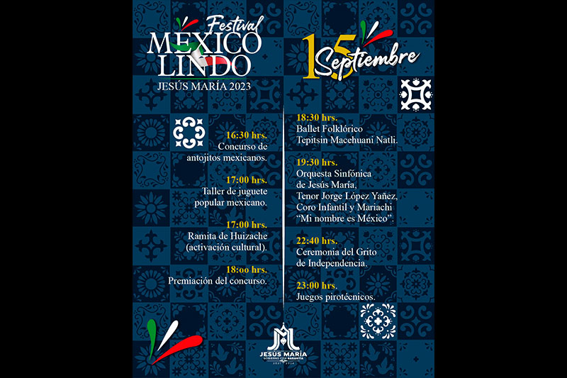 Con motivo de las fiestas patrias y para arraigar entre la población las tradiciones mexicanas, el Municipio de Jesús Marías, a través de la Instancia de Cultura, prepara el Festival México Lindo 2023 a realizarse del 15 al 17 de septiembre, informó Flor Zavala Soto.