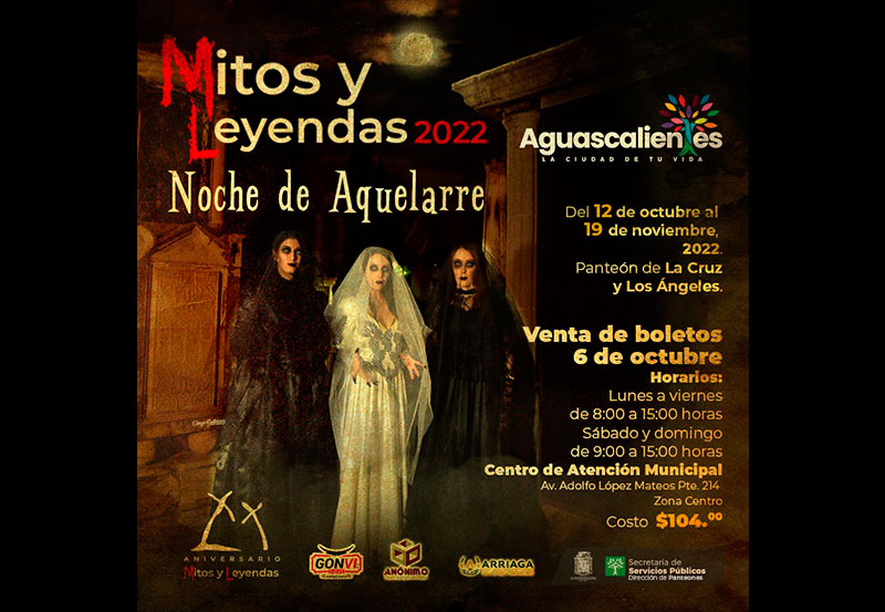 Enigmáticos dramas e historias de terror en noches de brujas, se representarán en los panteones La Cruz y Los Ángeles, del 12 de octubre al 19 de noviembre, en el marco del tradicional espectáculo Mitos y Leyendas 2022 “Noche de Aquelarre”, para el cual se abrirá la venta de boletos el jueves 6 de octubre en las instalaciones del Centro de Atención Municipal (CAM).