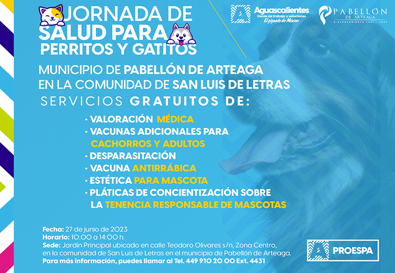 El Gobierno del Estado, a través de la Procuraduría Estatal de Protección al Ambiente (Proespa), ofrecerá diversos servicios gratuitos para las mascotas, como valoración médica, desparasitación, estética, vacunas para cachorros y adultos, así como pláticas de concientización para los propietarios sobre la tenencia responsable de mascotas; la jornada se llevará a cabo el próximo martes 27 de junio en la Comunidad de San Luis de Letras, del municipio de Pabellón de Arteaga.