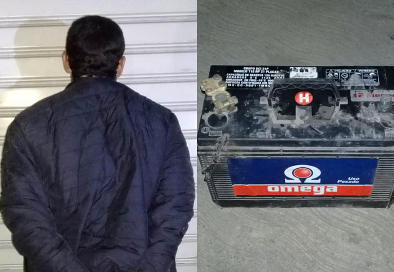 Individuo señalado como presunto responsable de robo de un acumulador fue asegurado por la Policía Municipal de Aguascalientes durante la madrugada de este jueves, luego de que fue detectado por un sistema de Seguridad en el momento en que retiraba la batería de un camión de transporte urbano.