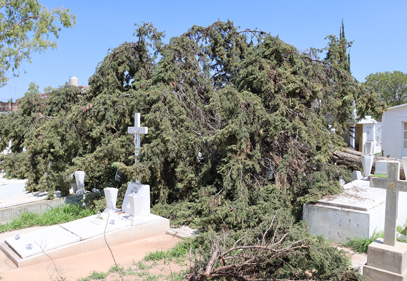 Ante la caída de algunos árboles ocasionadas por la intensa lluvia registrada en días pasados y el reblandecimiento de la tierra, el Municipio de Aguascalientes realiza revisiones en los 13 panteones municipales con la finalidad de brindar a los visitantes espacios seguros.