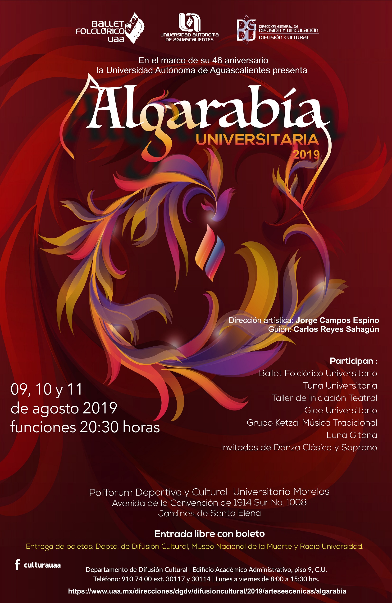 La Universidad Autónoma de Aguascalientes, a través de la Dirección de Difusión y Vinculación, presentará Algarabía Universitaria 2019, un espectáculo artístico multidisciplinario en el que alumnos darán muestra de su talento mediante diversos géneros dancísticos, musicales y teatrales.