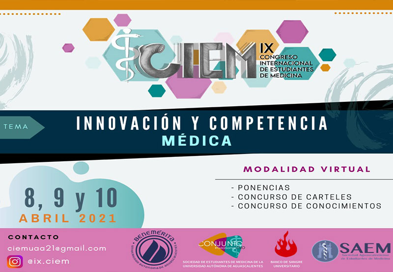 Los días 8, 9 y 10 de abril se llevará a cabo IX Congreso de Estudiantes de Medicina, evento organizado por la Sociedad de Estudiantes de Medicina de la Universidad Autónoma de Aguascalientes, la Sociedad Aguascalentense de Estudiantes de Medicina (SAEM) y el Banco de Sangre Universitario. El congreso contará con más de una decena de ponencias de especialistas en distintas ramas de las ciencias de la salud. Cabe destacar que está destinado a alumnos de la carrera de Médico Cirujano de todos los semestres y universidades de educación superior del país, no tendrá costo y se realizará de manera virtual.