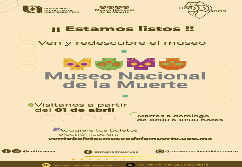 La Universidad Autónoma de Aguascalientes reabrirá las puertas de su Museo Nacional de la Muerte a partir del próximo 1° de abril, luego de casi tres años en los que este espacio se mantuvo cerrado, primero, a causa de la contingencia vivida por la COVID-19, y posteriormente ante el arranque de obras y trabajos de adecuación y remodelación en diversas áreas.